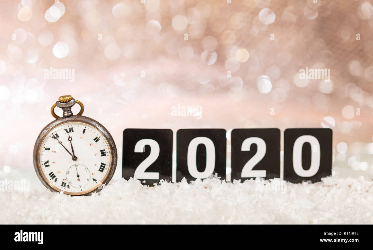 2020 Capodanno celebrazione. Minuti a mezzanotte su un vecchio orologio, bokeh sfondo festivo Foto stock - Alamy