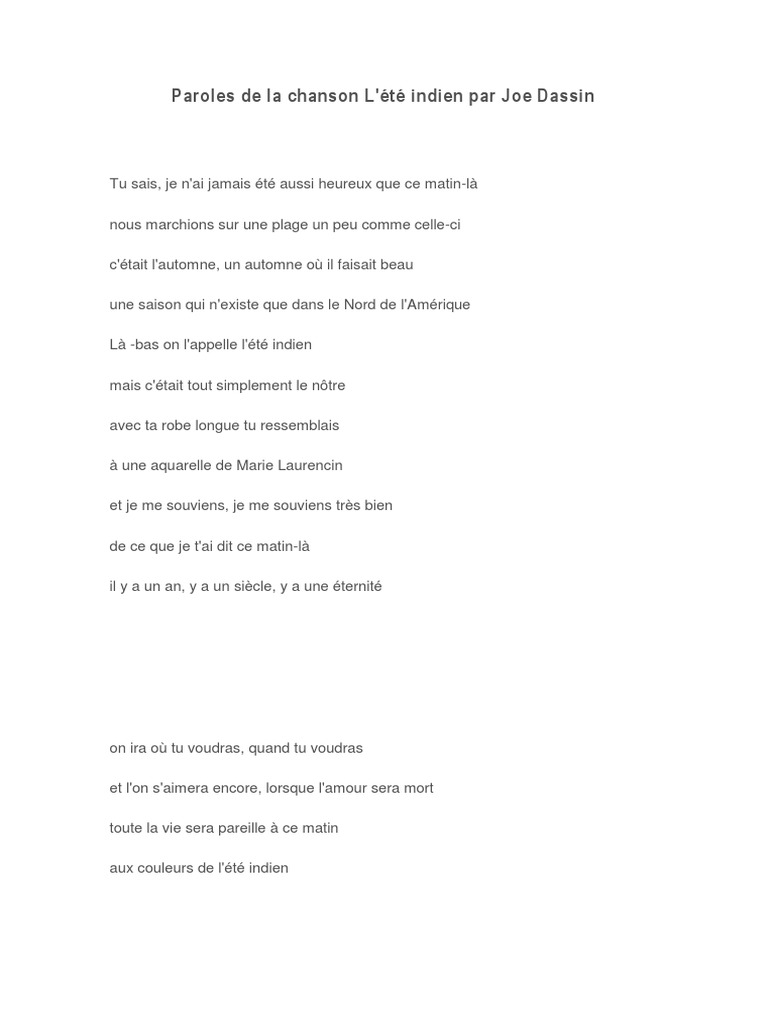 Paroles De La Chanson L Ete Indien Joe Dassin